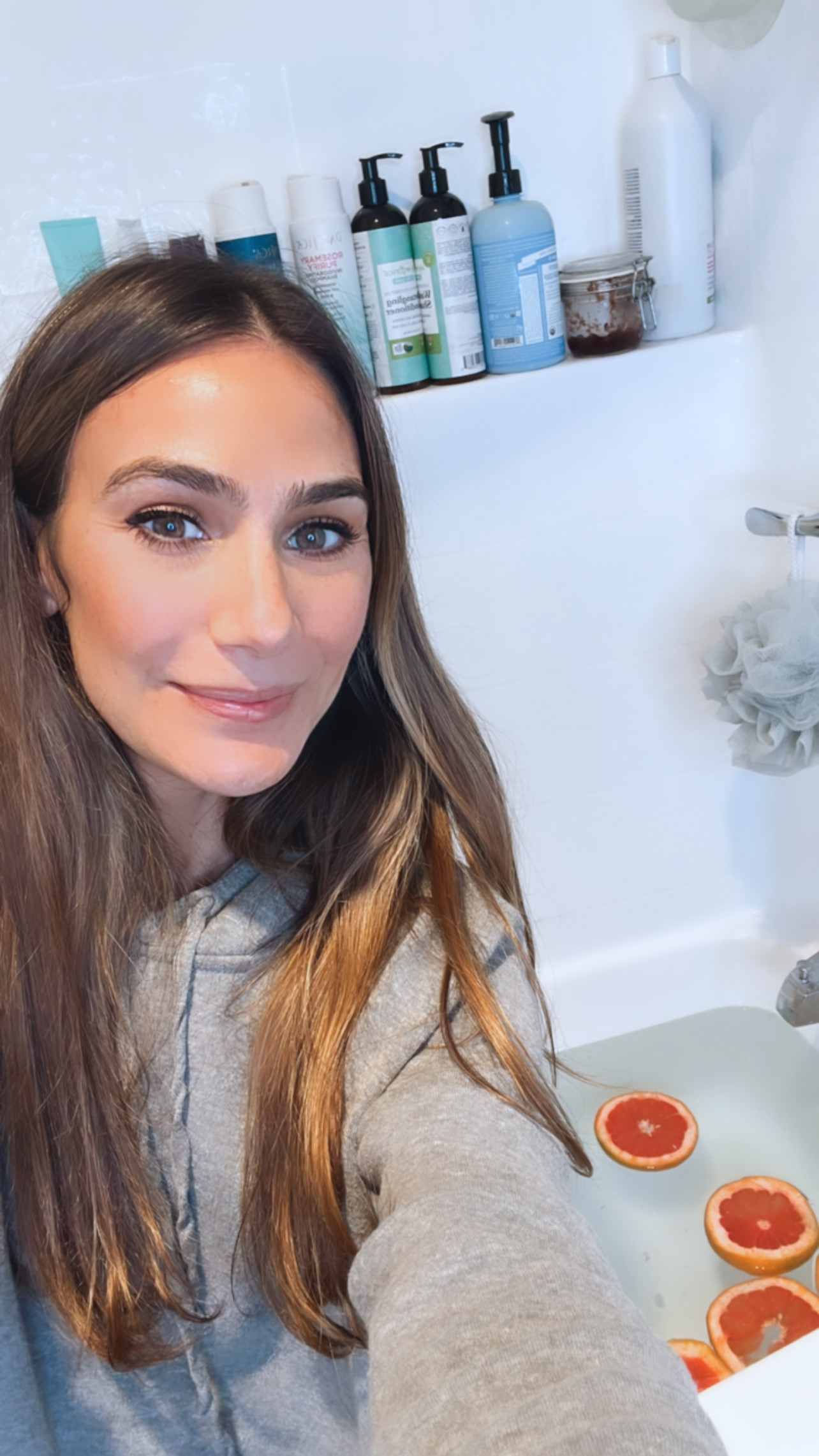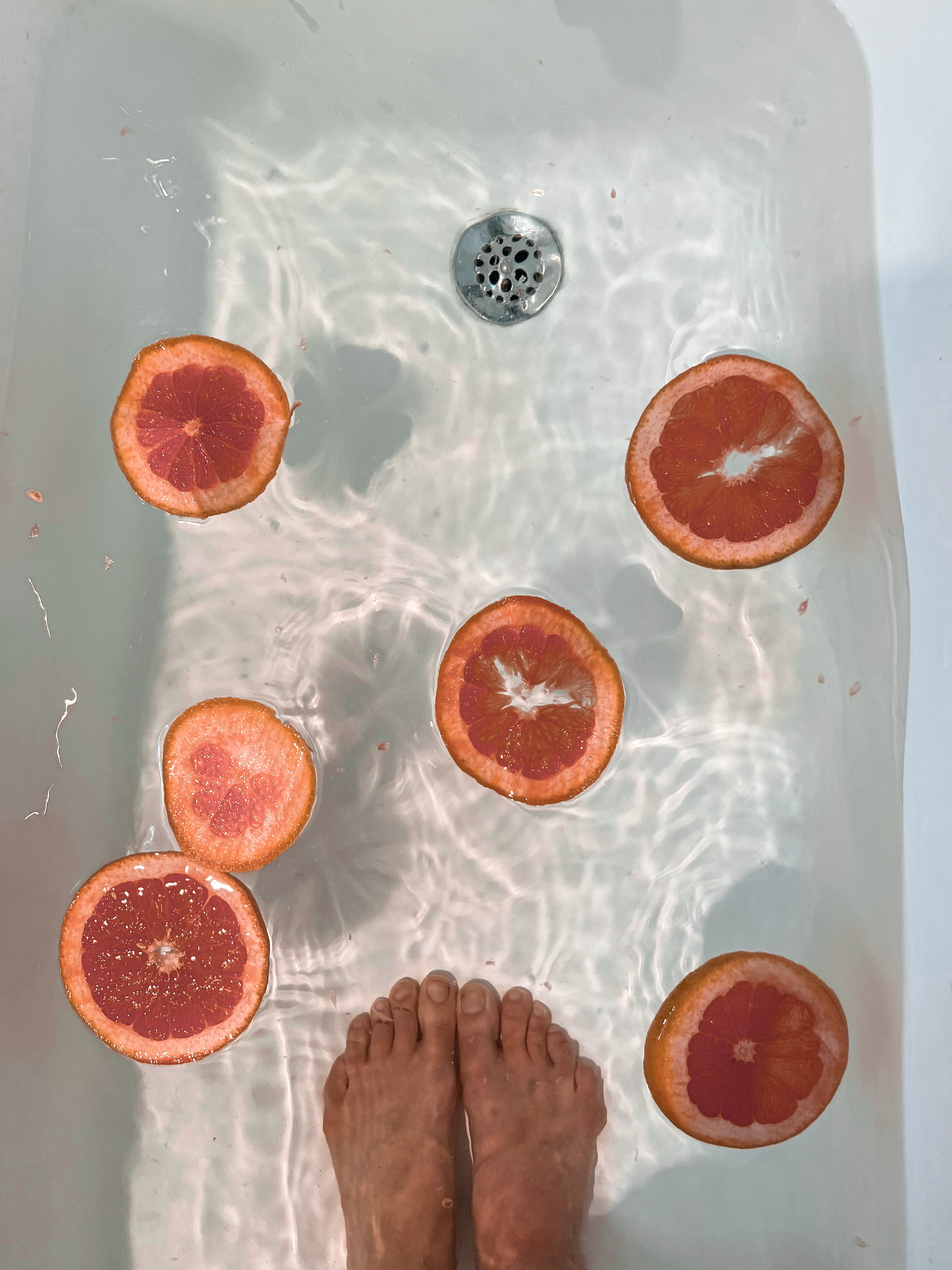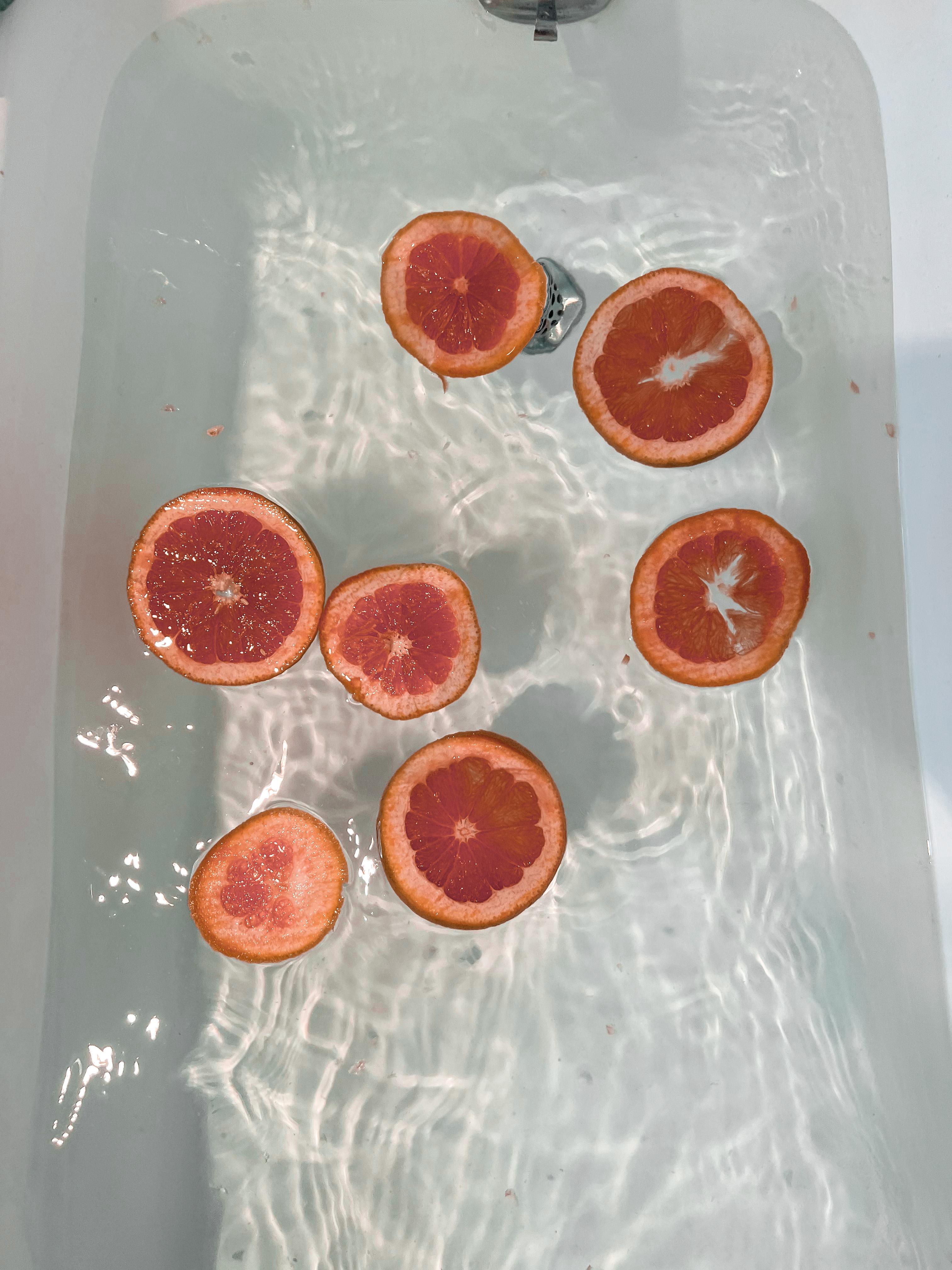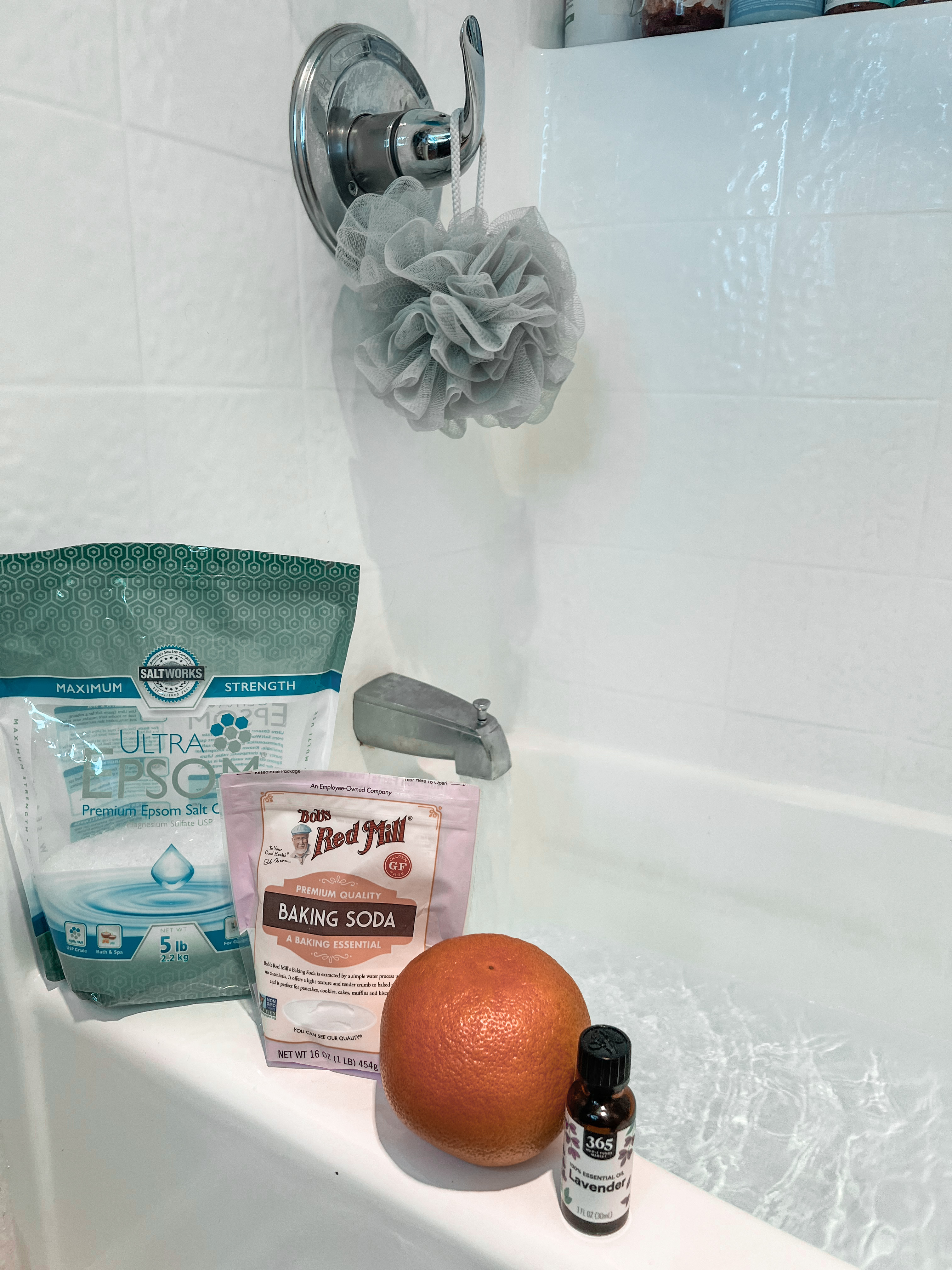 - Draw a warm bath and while the water is running pour in the Epsom salt, baking soda, lavender essential oil and grapefruit wheels.