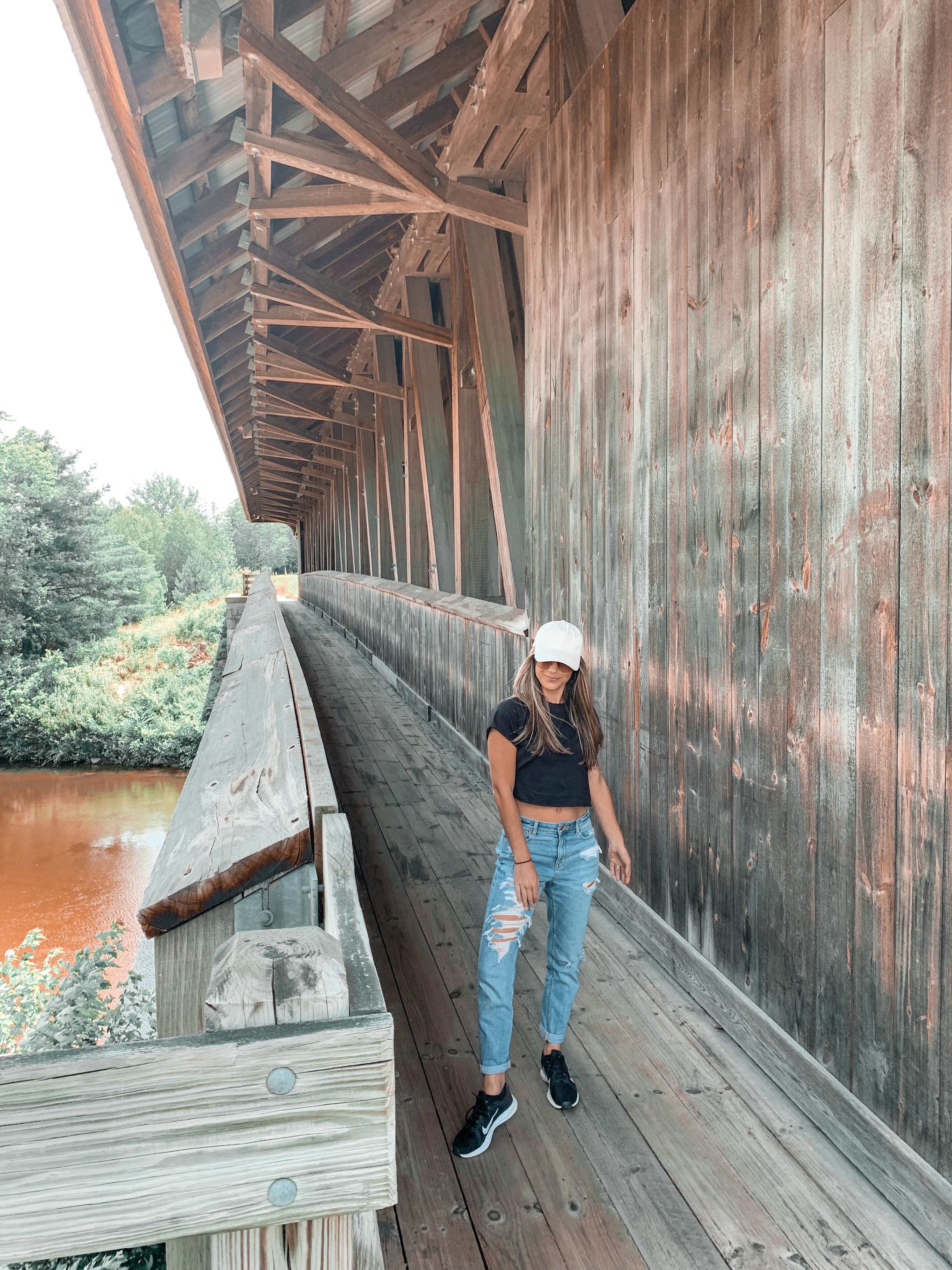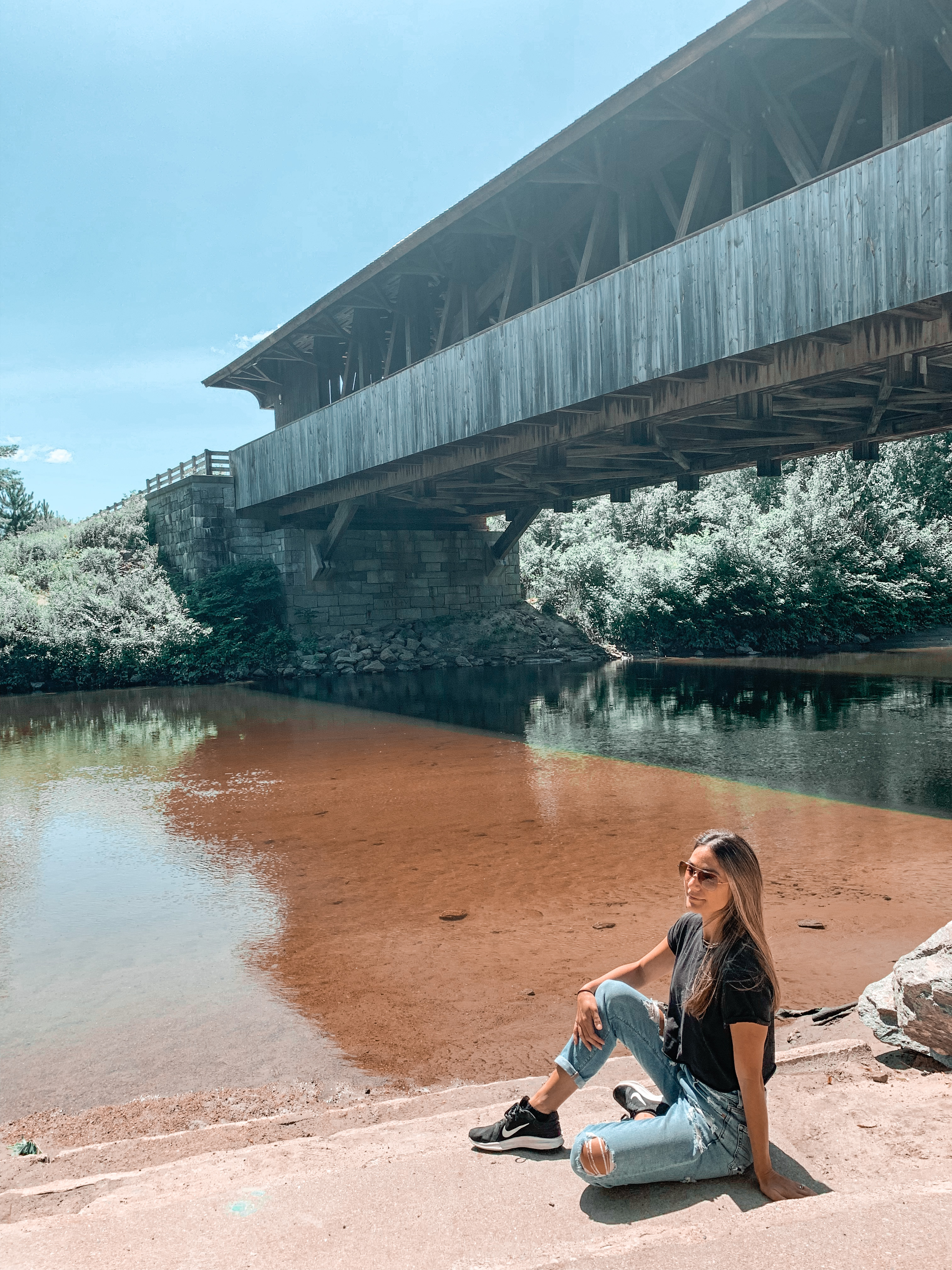 After our walk, we drove around and found a few more scenic spots to stop at. We came across the historical Smith Bridge which was originally built in 1850. I had to check it out because it reminds me of my childhood. These New England covered bridges are so iconic and picturesque. There is a bright green grassy field aside the parking lot and below the covered bridge is some sort of body of water with steps leading down.
