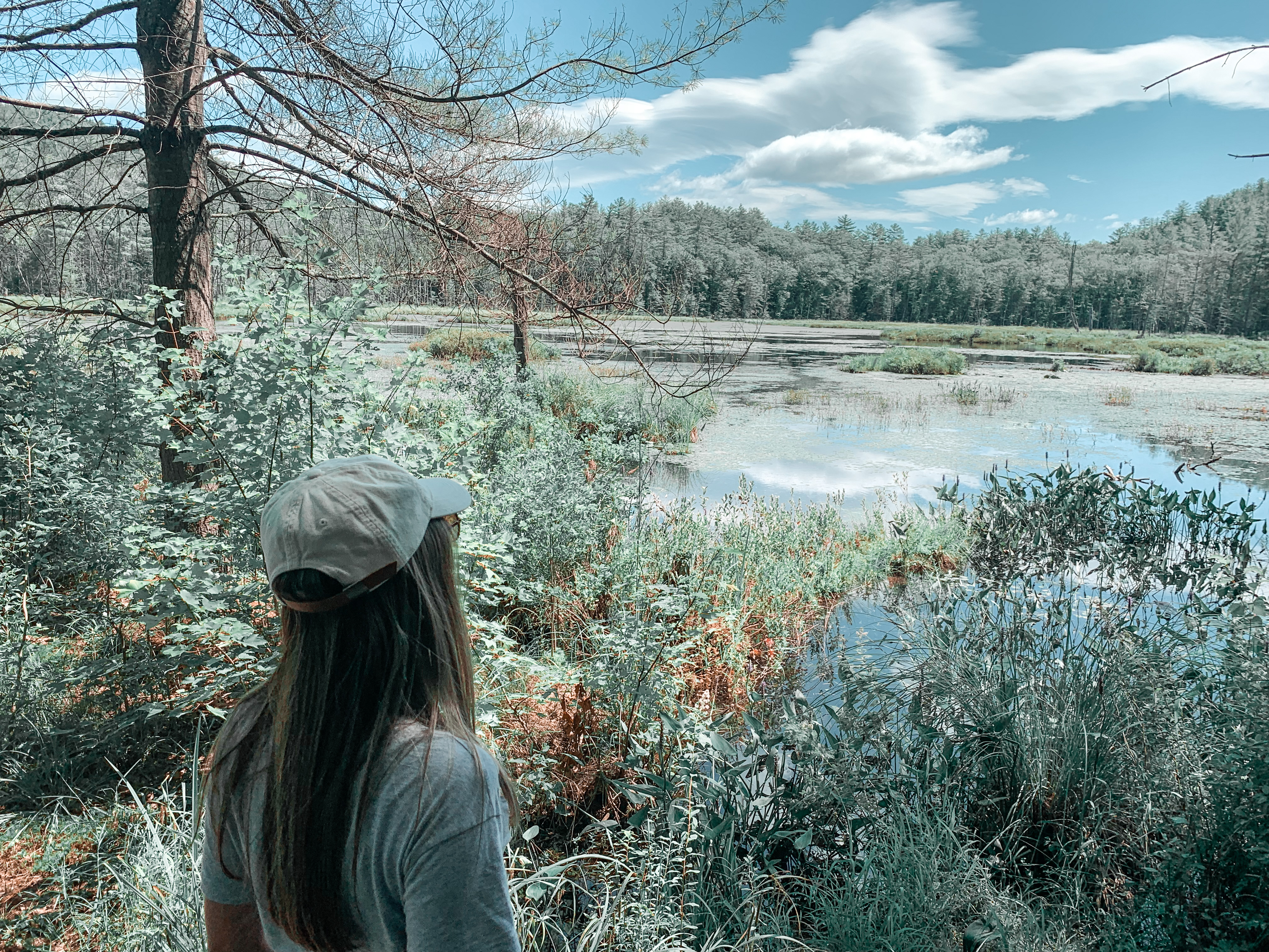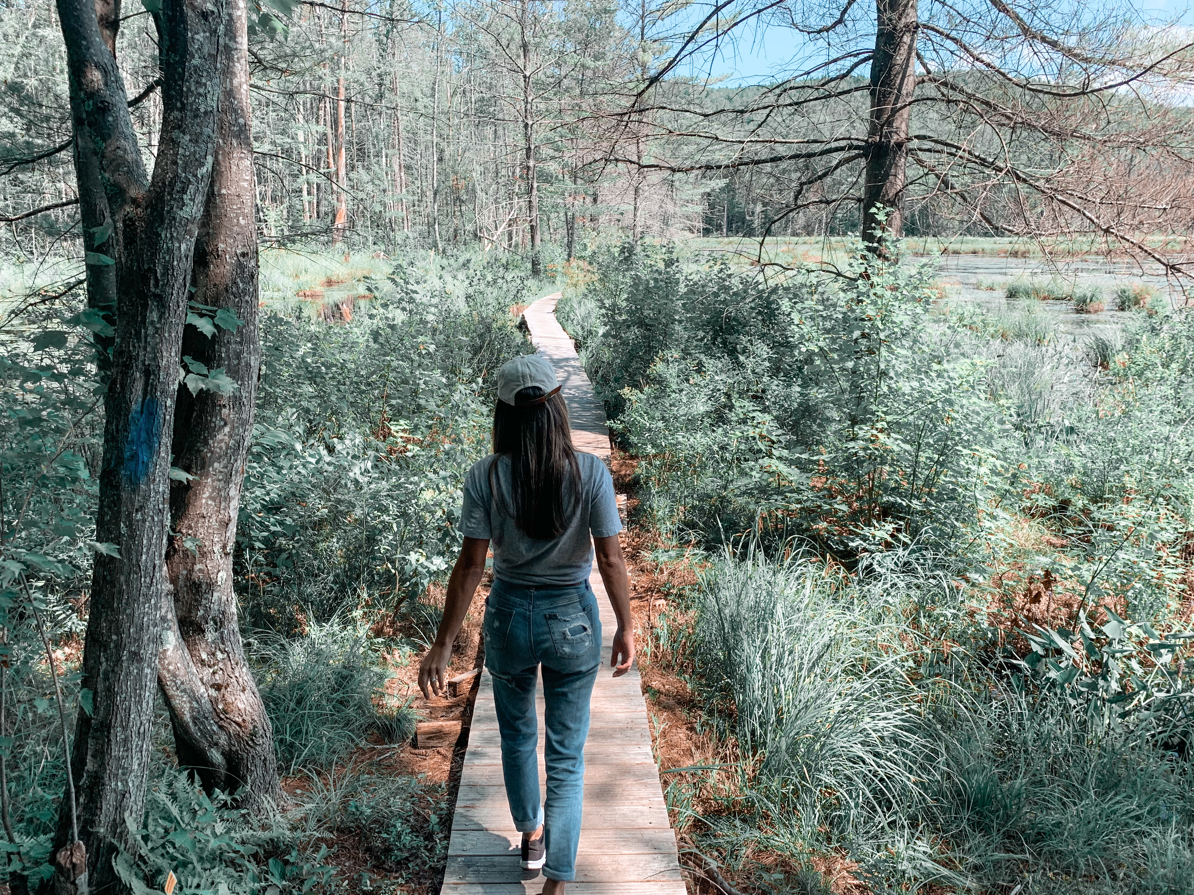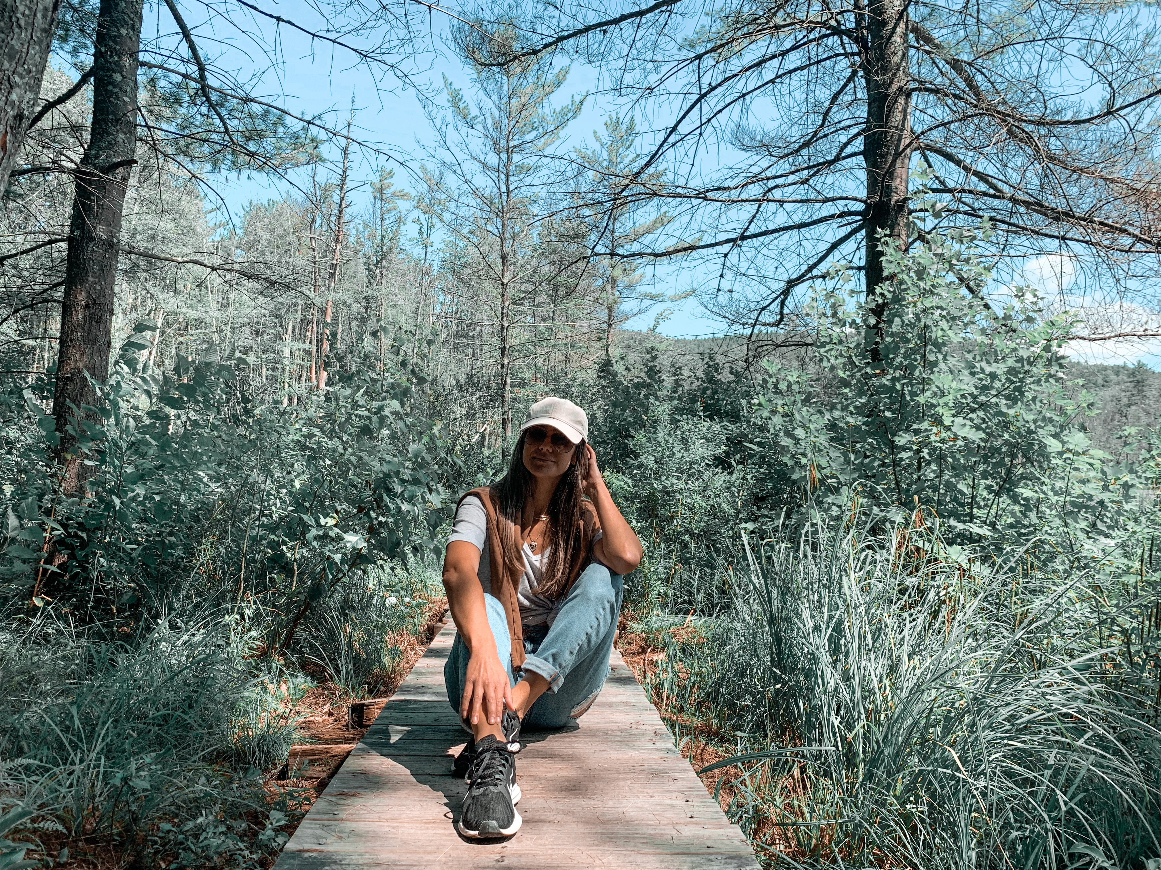 It wasn’t hard to find beautiful places to explore in Plymouth, NH. The little town is located in the White Mountains Regions and was just the perfect serene nature trip I needed. We first stopped at The Quincy Bog a nature area with walking and hiking trails. Since we didn’t have too much time, my husband and I just took a little stroll and enjoyed the idyllic scenery. There is a wooden plank path over the bog and a cute little bench making for a picture perfect spot to take in the sights of Quincy Bog.