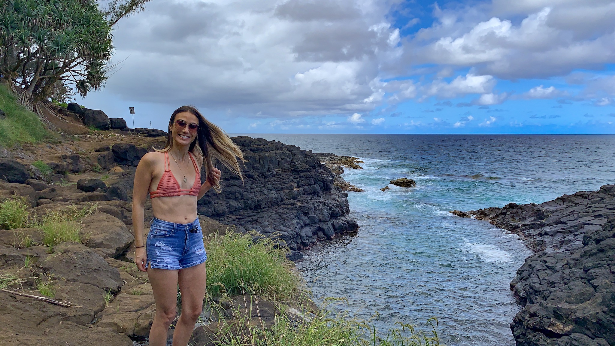 Plug “Queen’s Bath” into Google maps and the directions will take you to a very small parking lot at the trailhead. The address populates as Kapiolani Loop Princeville, HI 96722. You can also click on the All Trails link. Since this parking lot is super small another option to park is location down the street at the Princeville Makai Golf Course. Just park and walk up to the golf shop on site and pay for a day pass. The walk is about 10 minutes or so to the Queen’s Bath trailhead. I opted to park at the golf course as the trailhead lot was full upon my arrival and I didn’t mind walking; I was in Hawaii after all!